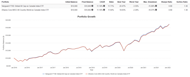 Below you can see the performance of both funds since 2016 (the earliest inception date of XAW).
